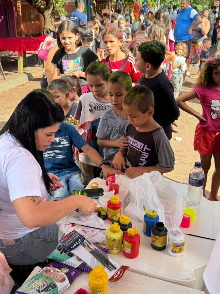 O bairro Cidade Nova se transformou no epicentro da alegria infantil em Foz do Iguaçu. A missão das Onças do Bem era clara: criar um Dia das Crianças memorável, um evento que tomasse conta do espaço público e o convertesse em um território livre para a imaginação, a brincadeira e a felicidade. Nossa equipe de voluntárias trabalhou com um entusiasmo contagiante para montar diferentes estações de diversão: uma área com música animada que convidava todos a dançar, um espaço dedicado a gincanas e jogos que desafiavam a garotada, e, claro, a tão aguardada mesa repleta de doces e brinquedos, cuidadosamente selecionados para iluminar o rosto de cada pequeno presente.