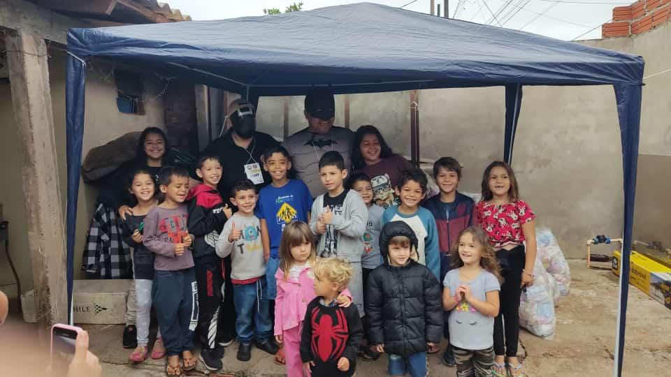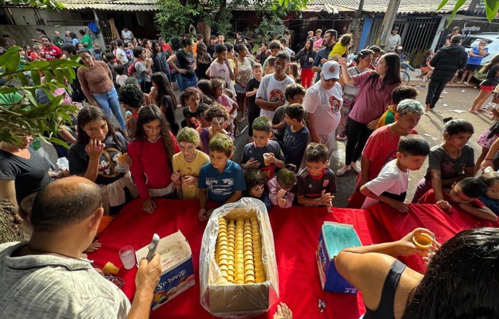 A memória de outubro de 2022 no bairro Cidade Nova é a prova viva de que a determinação e o carinho não temem o mau tempo. O céu amanheceu cinzento e uma chuva insistente caiu sobre Foz do Iguaçu, um cenário que para muitos seria motivo de cancelamento. Mas para as Onças do Bem, uma promessa feita a uma criança é sagrada e inegociável. Com a garra que nos define, nossa equipe não apenas manteve o evento, mas o abraçou como uma missão ainda mais especial. Se a chuva trazia o frio de fora, nós levaríamos o dobro do calor humano para dentro. Adaptamos o espaço, criamos uma estrutura acolhedora e trabalhamos com energia redobrada, movidas pela certeza de que a alegria daquelas crianças seria o sol que iluminaria aquele dia cinzento. A mensagem era clara: nenhum obstáculo é grande o suficiente para impedir a celebração da infância.